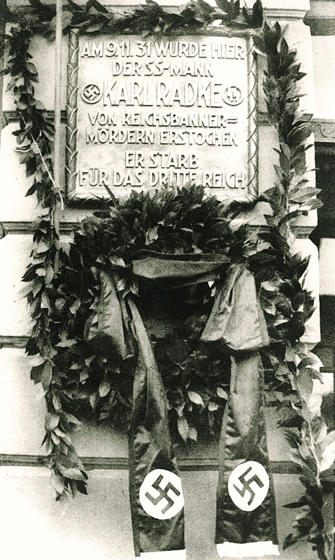 Hier verkehrten die Anhänger der NSDAP und die Mitglieder der uniformierten Sturmabteilung (SA). Zwischen ihnen und den im schräg gegenüber liegenden „Gasthof Stadt Kiel“ verkehrenden Angehörigen des Reichsbanner kam es immer wieder zu gewalttätigen Auseinandersetzungen. Im Verlauf einer Gedenkfeier von SPD und Reichsbanner anlässlich des Jahrestages der Revolution von 1918 wurde der SS-Mann Karl Radke vor dem Lokal tödlich verletzt.