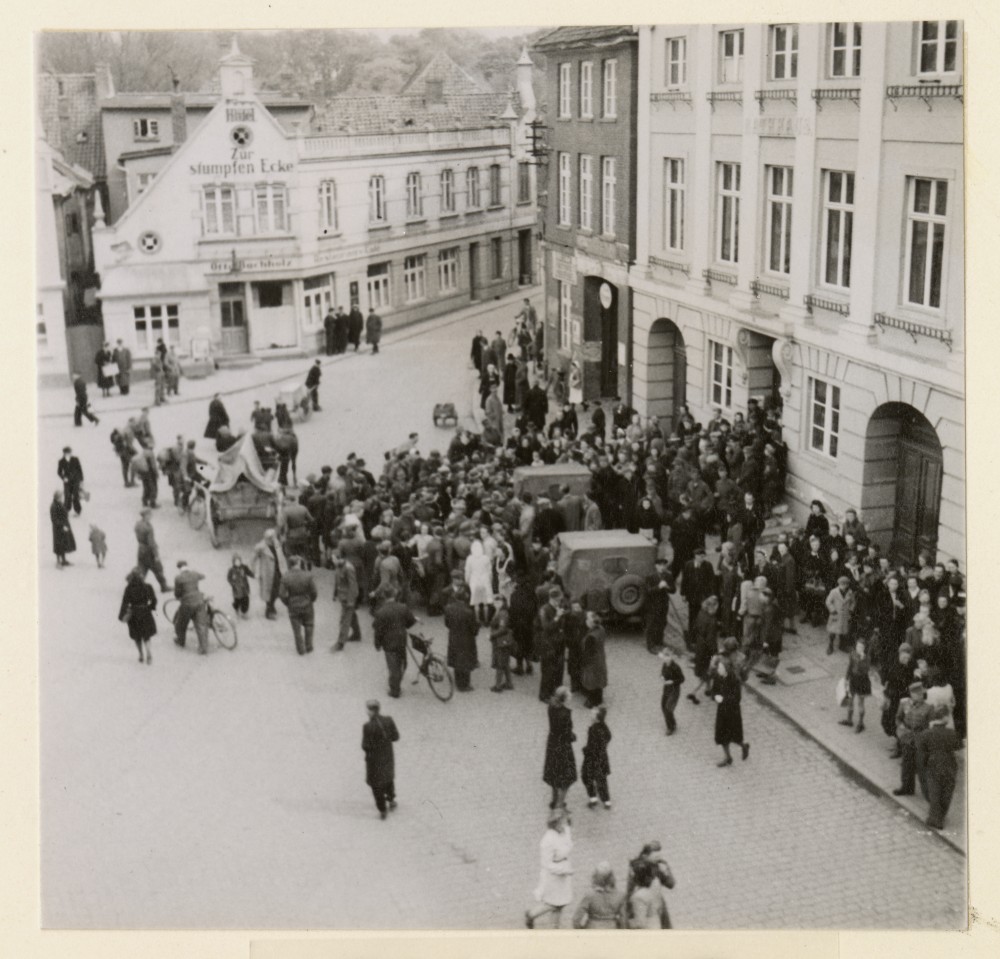 Erst am Folgetag kamen drei britische Kriegsberichterstatter auf dem Weg nach Kiel durch Eutin und hielten gegen 15 Uhr mit zwei offenen US-Militärjeeps vor dem Rathaus. Zu ihrer Überraschung wurde ihnen die Stadt prompt „von Eutiner NS-Honoratioren vor dem Rathaus“ übergeben. Die drei Soldaten, die abgesehen von ihren Kameras und vermutlich Pistolen so gut wie unbewaffnet waren, nahmen, wie sie später in ihrem Bericht festhielten, die Stadt „unter Kontrolle“, gaben erste Anweisungen an Stadtverwaltung und Polizei und ordneten an, dass Schusswaffen und Munition abzugeben seien. Einige wenige Gewehre wurden daraufhin auf dem Marktplatz verbrannt. Die britischen Kriegsberichterstatter dokumentierten das ganze Geschehen. Die Fotos zeigen auch die beiden Militärjeeps, die ebenso wie ihre Insassen von einer großen Menschenmenge umlagert sind. Am 5. Mai erfolgte dann die offizielle Übergabe der Stadt und damit die endgültige Befreiung vom Nationalsozialismus in Eutin.